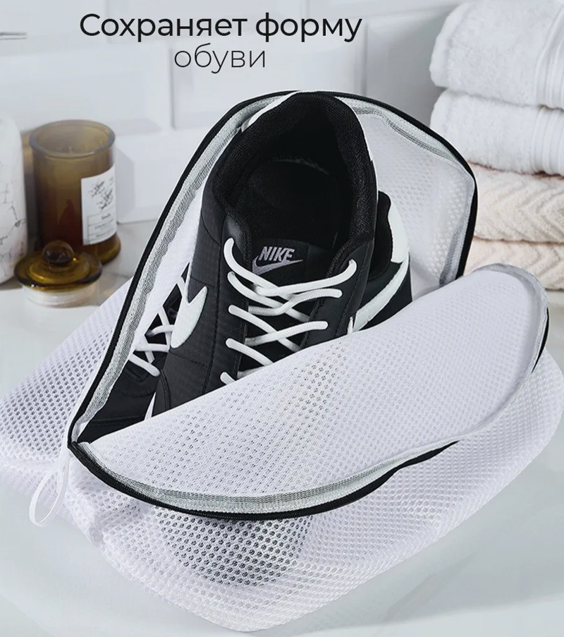 Мешок для стирки обуви в стиральной машине позволяет отстирать кроссовки, кеды и другую обувь без повреждения барабана стиральной машины и без деформации самой обуви.