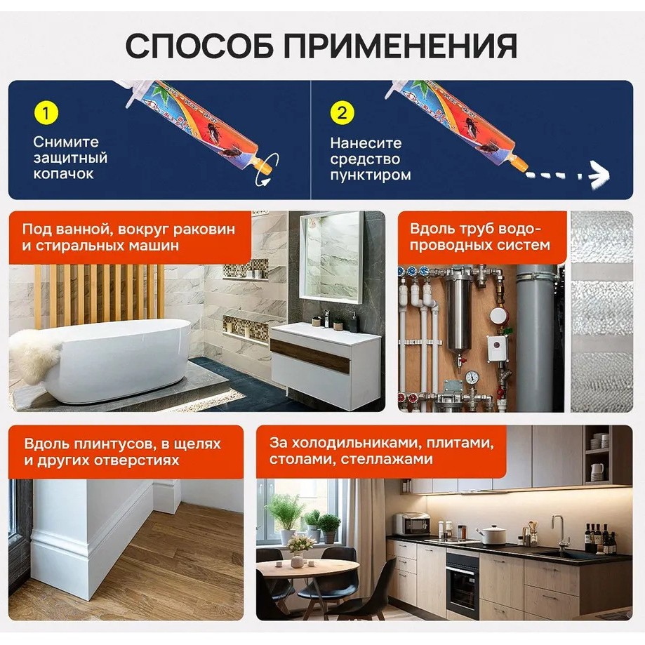 Способ применения: Снимите защитный колпачок, нанесите гель пунктирной линией в местах массового скопления насекомых: под ванной и раковиной, у плинтусов, за мебелью, рядом с водопроводными трубами. Средство от тараканов эффективное приводит к эпидемии в колонии, что приводит к гибели всей популяции насекомых.