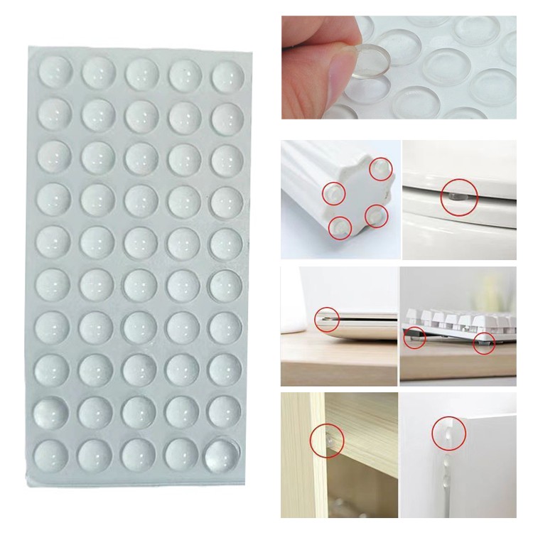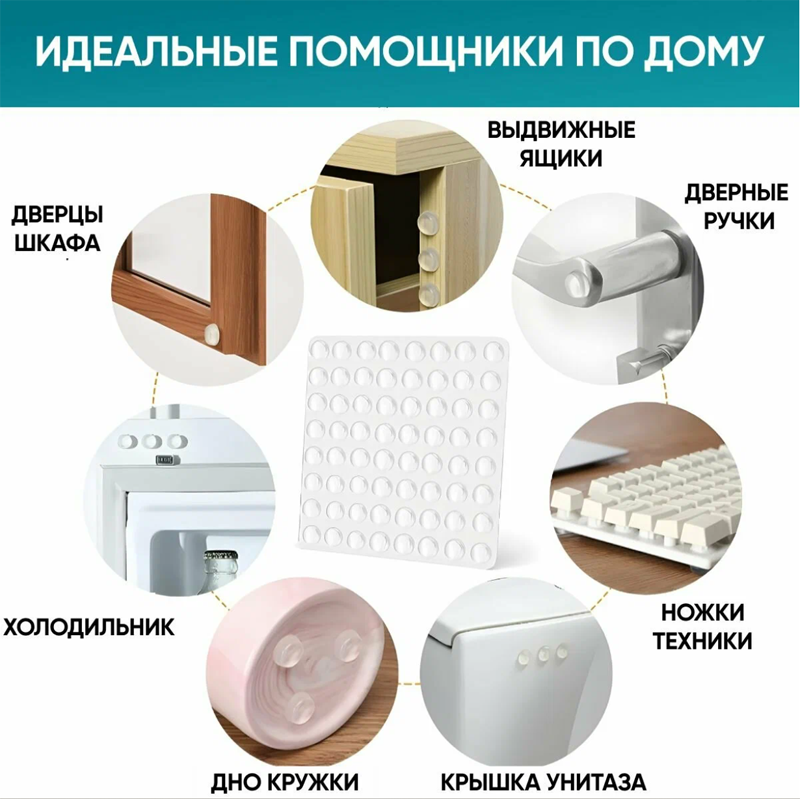 В набор входит 50 прозрачных силиконовых демпферов (амортизаторов) диаметром 10 мм на самоклеящейся основе.