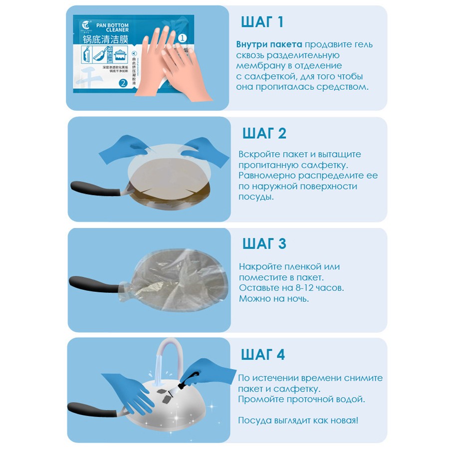 2. Вскройте пакет и вытащите пропитанную салфетку. Равномерно распределите ее по наружной поверхности посуды.