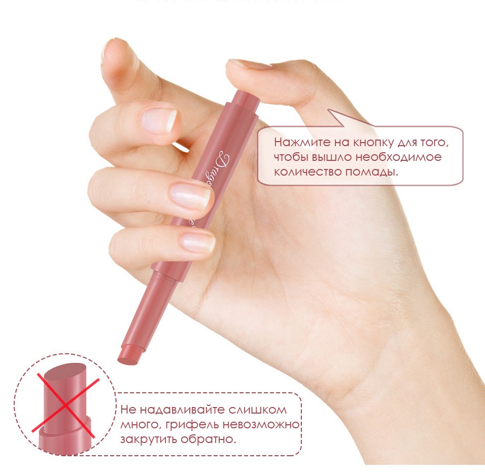 Способ применения: Нанесите помаду легкими движениями на губы от центра к уголкам.