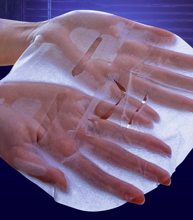 Тонкое тканевое лекало плотно прилегает, транспортируя все активные компоненты в эпидермис.