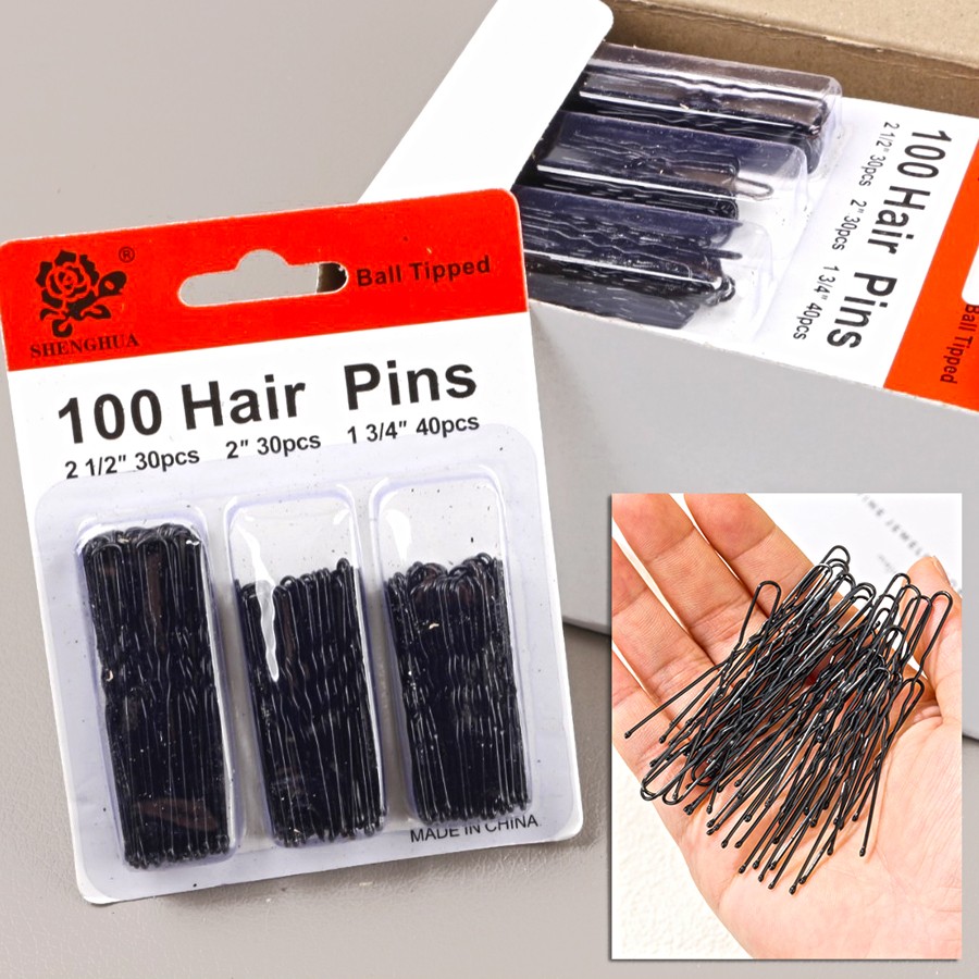 Набор состоит из 100 шпилек черного цвета размером 4,5 см, 5 см и 6 см.