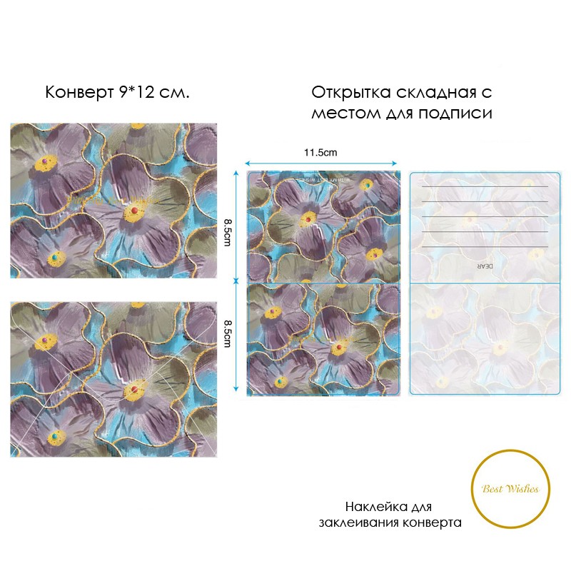 Открытка дополнена белым конвертом с наклейкой и упакована в индивидуальный прозрачный пакетик.