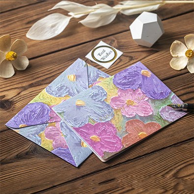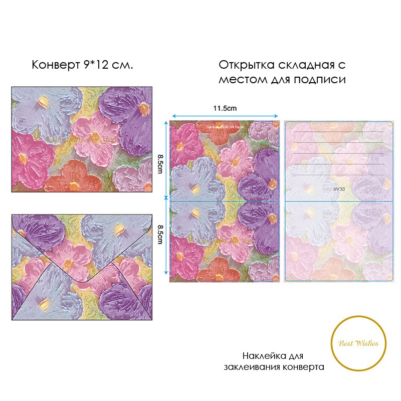 Открытка дополнена белым конвертом с наклейкой и упакована в индивидуальный прозрачный пакетик.