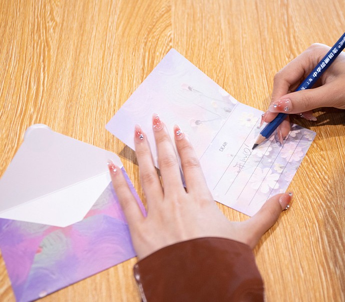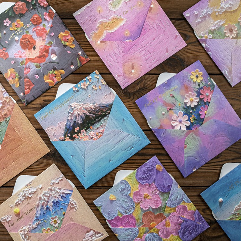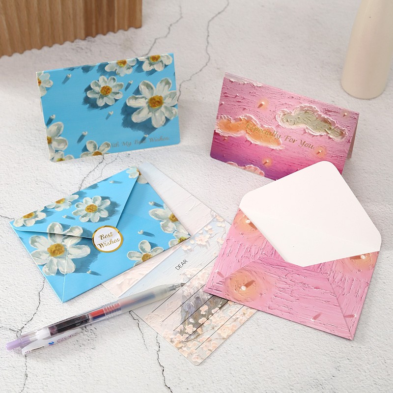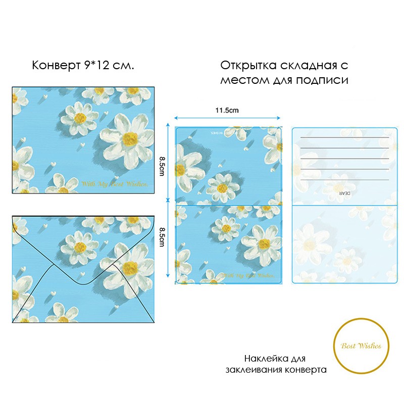 Открытка дополнена белым конвертом с наклейкой и упакована в индивидуальный прозрачный пакетик.