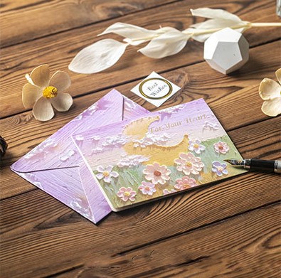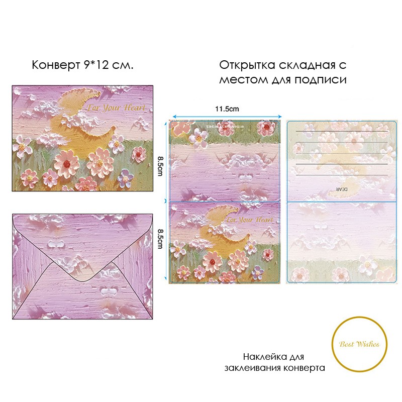 Открытка дополнена белым конвертом с наклейкой и упакована в индивидуальный прозрачный пакетик.