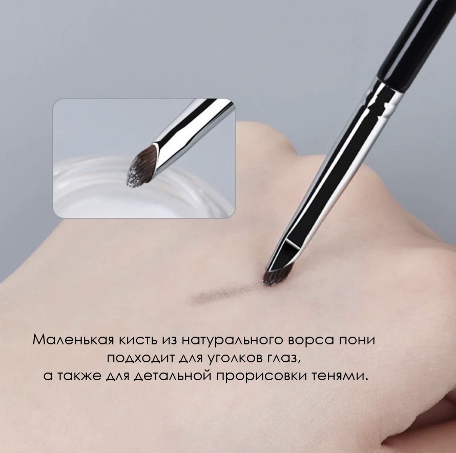 Маленькая кисть из натурального ворса пони подходит для уголков глаз, а также для детальной прорисовки тенями.