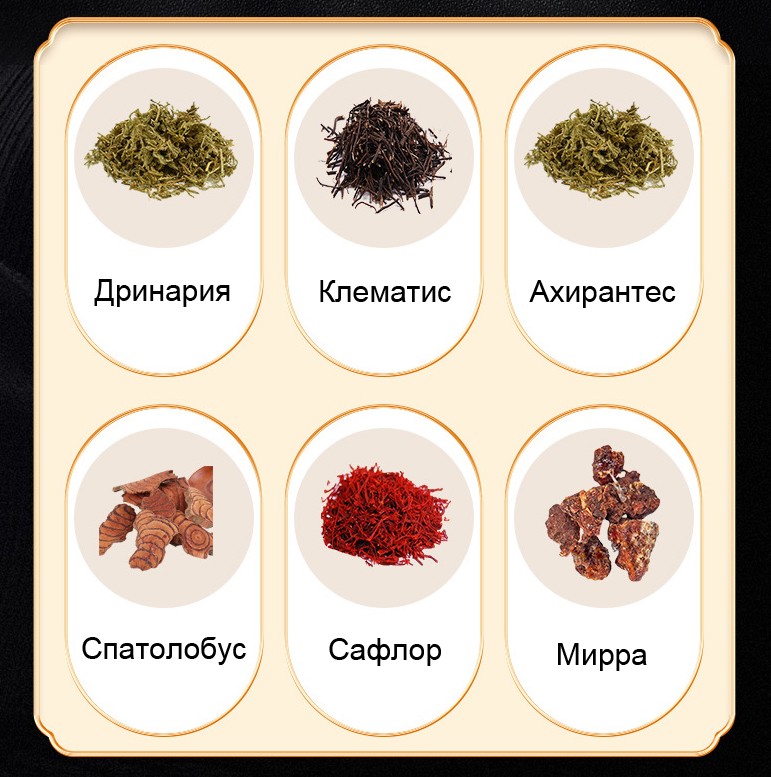 Составлен по древней рецептуре с использованием редких лекарственных трав и экстрактов: Дринария, Клематис, корень Ревеня, корень Спатолобуса, Сафлор, Ахирантес, Ладана и Мирры.
