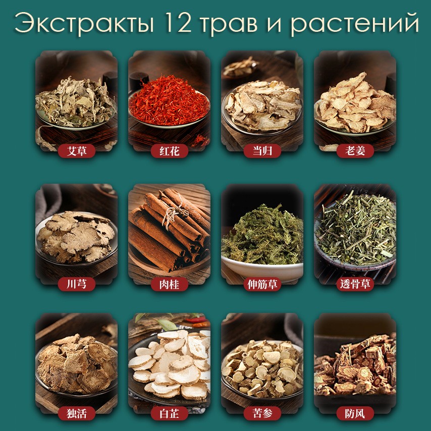 Состав: Полынь, Сафлор, корень Дягиля, Имбирь, корень Чуаньсюн, Корица, Смилакс, корень Пиона, Дягиль даурский, Софора желтоватая, соль для ванн, силера.