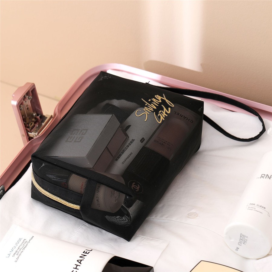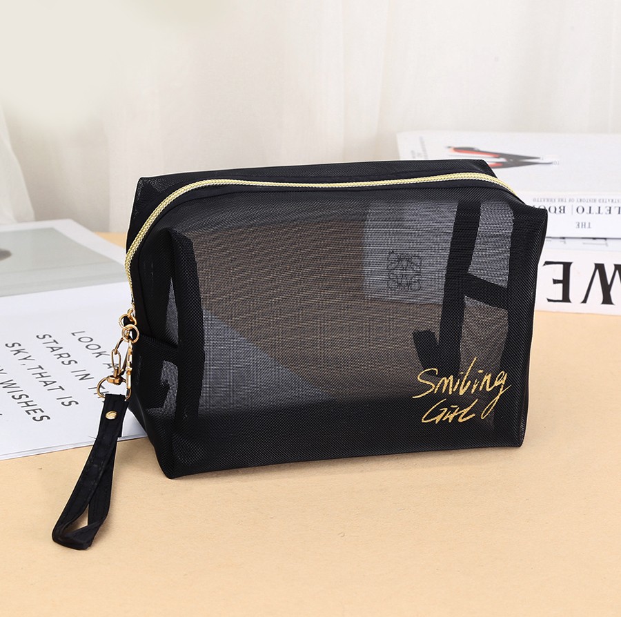 Прозрачный органайзер изготовлен из мягкой нейлоновой сетки в стильном черном цвете. Бегунок на молнии декорирован золотой звездочкой.