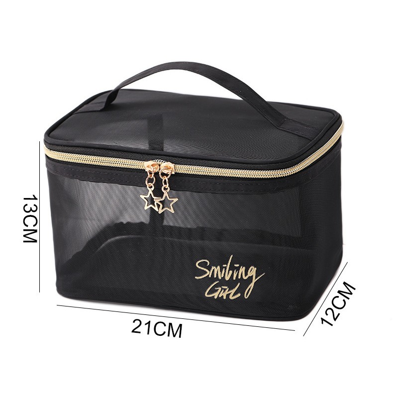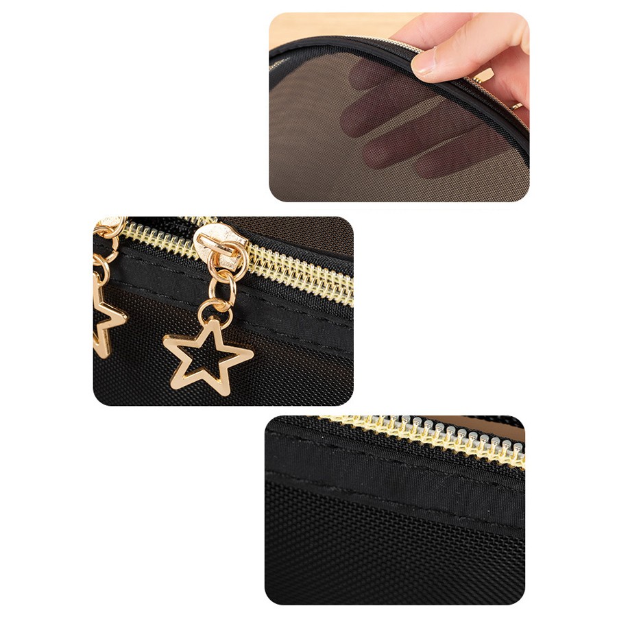 Прозрачный органайзер изготовлен из мягкой нейлоновой сетки в стильном черном цвете. Бегунок на молнии декорирован золотой звездочкой.