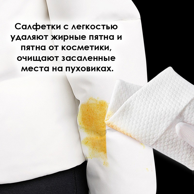 Чистящие салфетки для верхней одежды с легкостью удаляют жирные пятна и пятна от косметики, очищают засаленные места на пуховиках, т.к. рукава, воротник, место застежки.