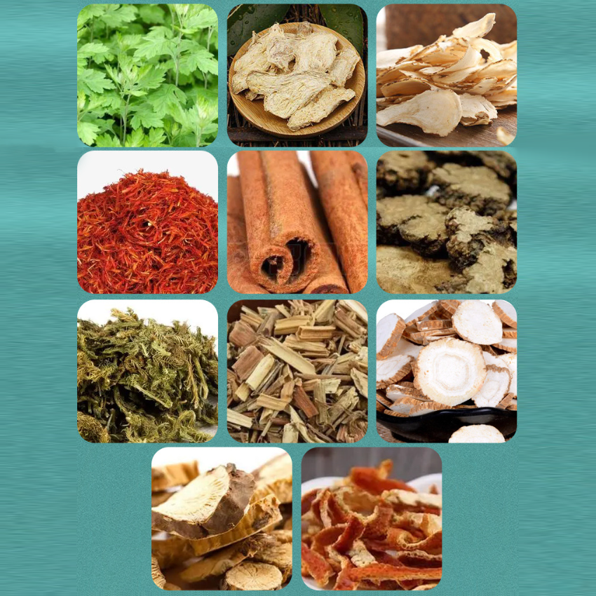 Состав: Полынь, Сафлор, корень Дягиля, корень Имбиря, Корица, Чуаньсюн, Смилакса голого корневище, Дягиль даурский, Софора желтоватая, Дудник, Селера.