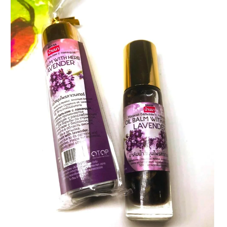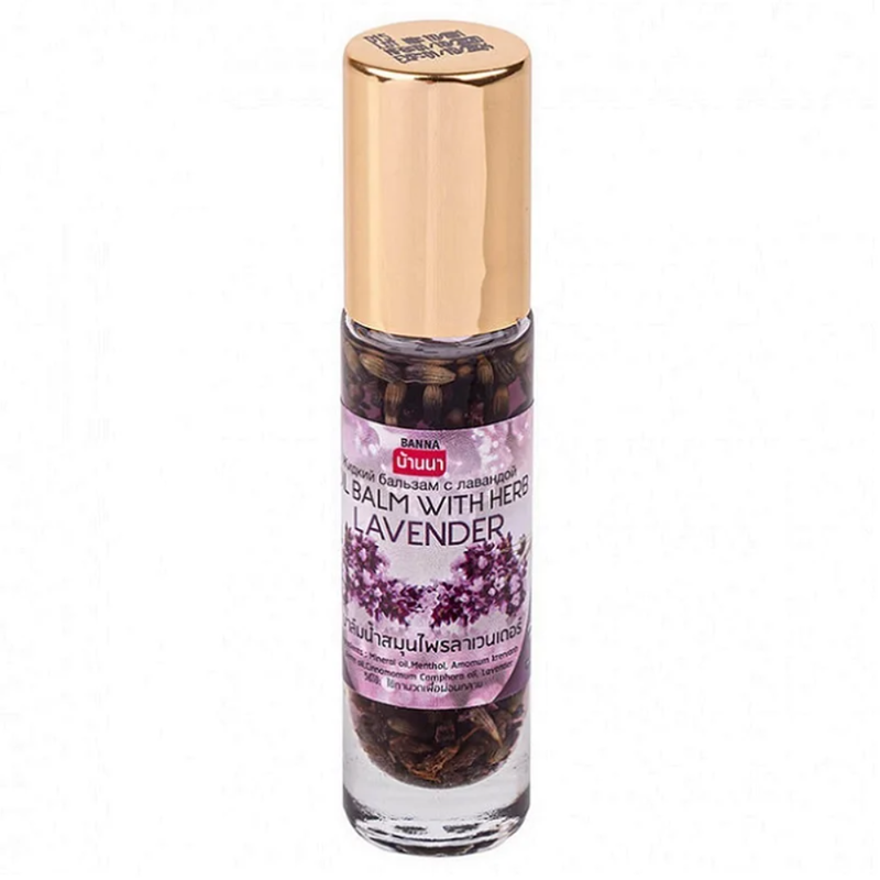 Жидкий масляный бальзам-ингалятор из Таиланда Banna с эфирными маслами и лавандой в стеклянном карандаше с роликовым дозатором поможет вам быстро избавиться от головных болей, мигрени, тошноты и головокружения.