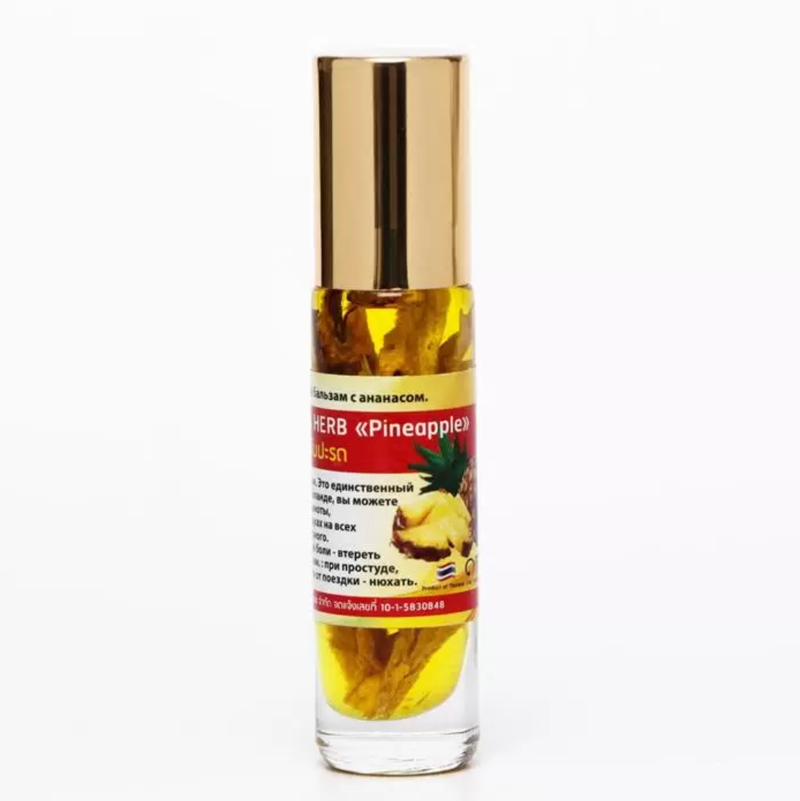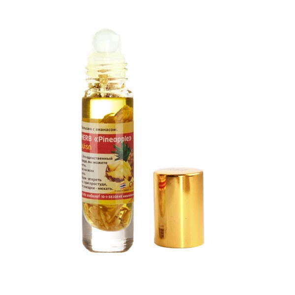 Banna Oil Balm With Herb Pineapple – это тайский жидкий бальзам с эфирными маслами и ананасом, популярное натуральное средство от укачивания, головной боли и насморка, очень приятно пахнущий и дополнительно настоянный на свежем ананасе.
