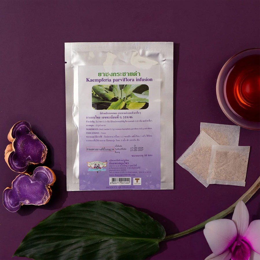 Травяной настой Кемпферии Кра-Чай-Дам (Kra-Chai-Dum) от тайского бренда Thanyaporn Herbs — это традиционный тайский фитосбор, ценимый за тонизирующее и общеукрепляющее действие.