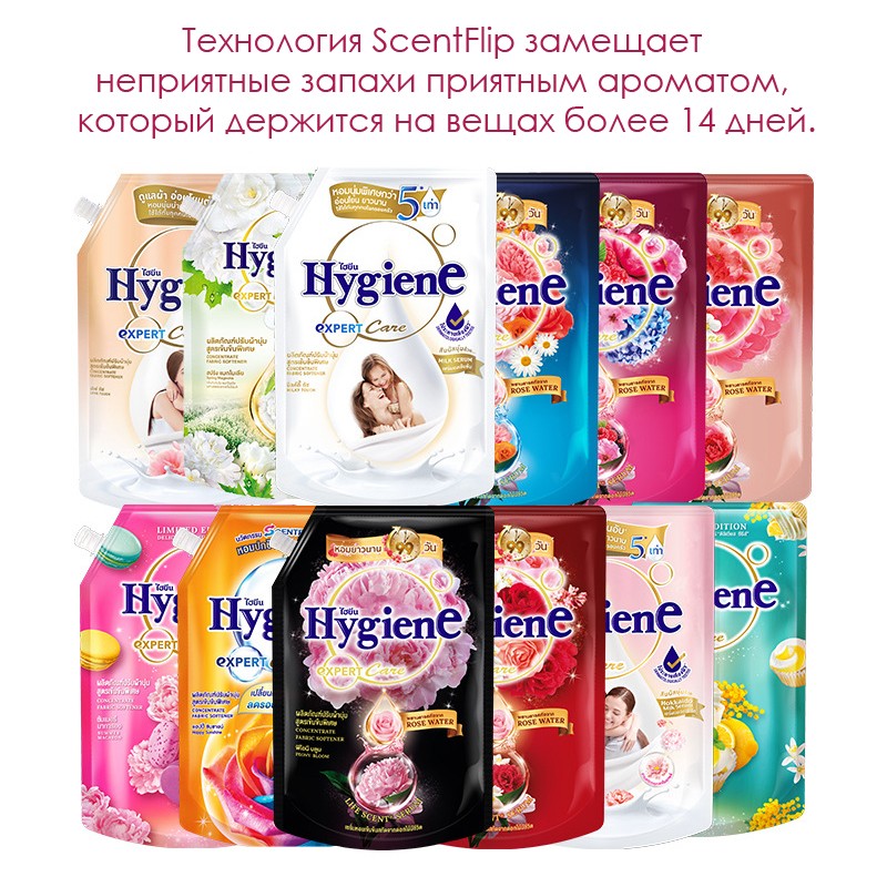 При создании кондиционера для белья Hygiene использовали инновационную запатентованную технологию: технология ScentFlip – она замещает неприятные запахи приятным ароматом, который держится на вещах более 14 дней.