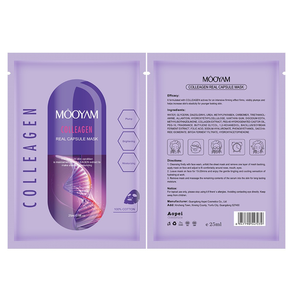 Тканевая маска для лица с коллагеном Mooyam предназначена для восполнения коллагена в клетках эпидермиса и возвращения коже упругости, эластичности и увлажненности.