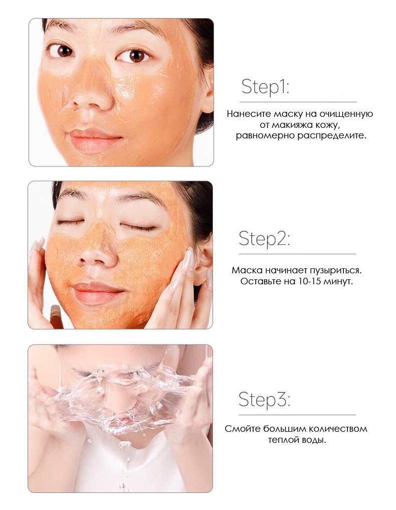 Состав маски вступает в реакцию с кислородом, микроскопические пузырьки проникают глубоко в поры и нежно и не травматично очищают их от грязи, жира и остатков макияжа.