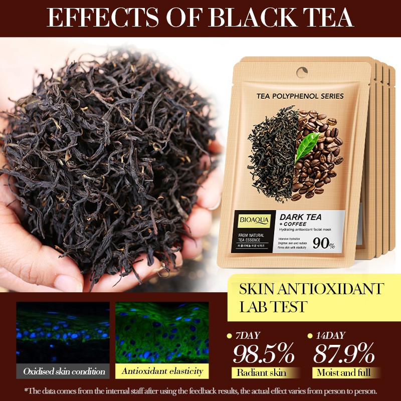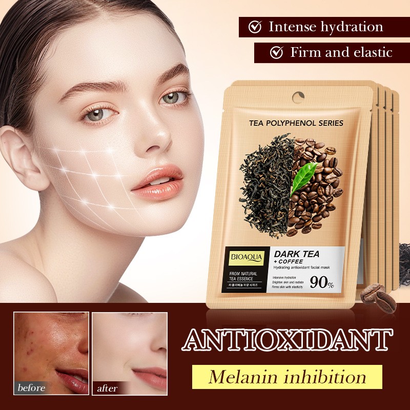 Тканевая маска с экстрактом темного чая и кофе прекрасно тонизирует и освежает, мягко осветляет и улучшает общий тон кожи.