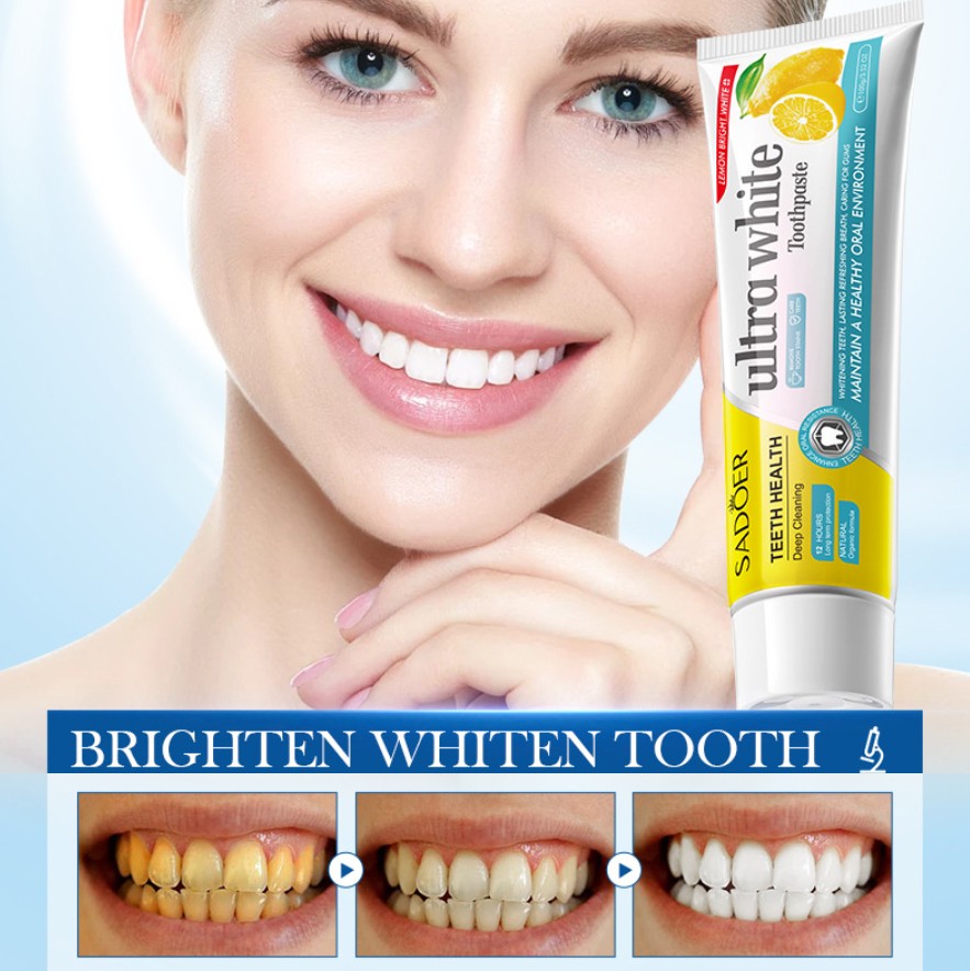 Зубная паста отбеливающая с маслом лимона Sadoer обеспечивает длительную свежесть с приятным лимонным вкусом.