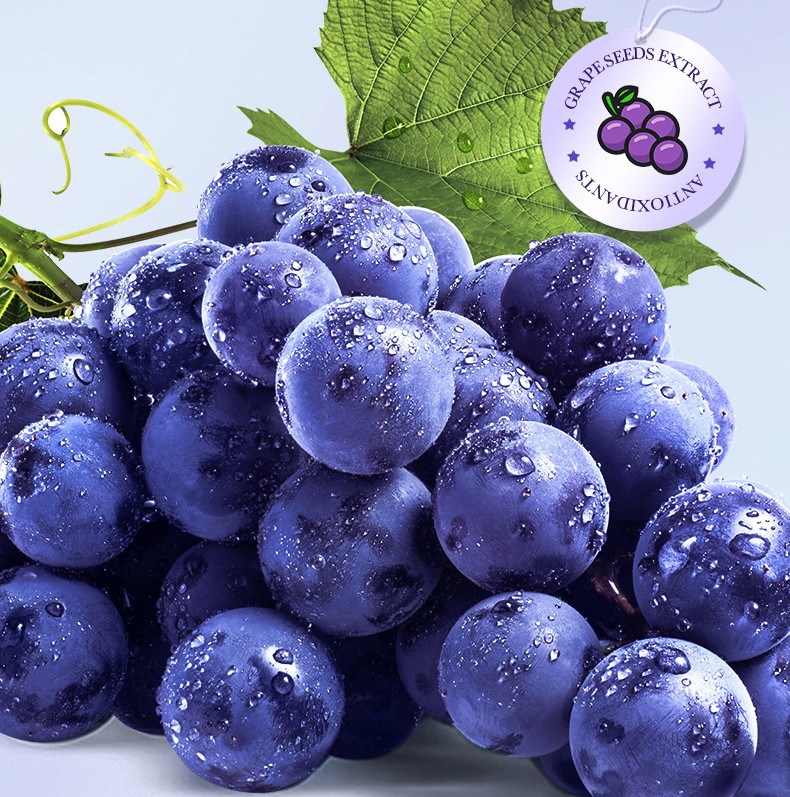 Экстракты винограда является источником витаминов, микроэлементов, необходимых увядающей кожи. Виноград осветляет тёмные круги и насыщает клетки эпидермиса антиоксидантами, питает и смягчает кожу.