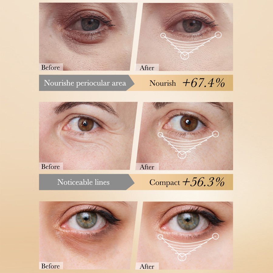 Благодаря специальной, удобной форме патчей, они плотно прилегают к области вокруг глаз и захватывают всю часть под глазами от внешнего до внутреннего уголка глаза с «гусиными лапками» за счет этого активные компоненты проникают во все глубокие слои кожи и насыщают ее своими полезными свойствами.