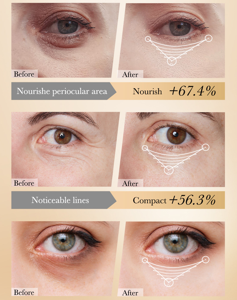 Благодаря специальной, удобной форме патчей, они плотно прилегают к области вокруг глаз и захватывают всю часть под глазами от внешнего до внутреннего уголка глаза с «гусиными лапками» за счет этого активные компоненты проникают во все глубокие слои кожи и насыщают ее своими полезными свойствами.
